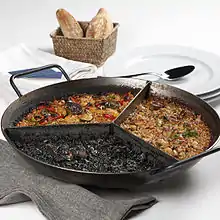- Paella — originally from Valencia, there's an infinite number of different paella variants. It's a rice dish with different vegetables, often seafood (fish, shrimp, mussels, calamari...) and/or meat (often chicken or rabbit). In restaurants, you often need to be more than one person ordering a pan of paella although at some places they serve paella to lone patrons as well.