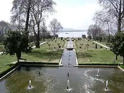 - 🌍 Nishat Bagh. Located on the eastern banks of Dal Lake, with the Zabarwan Mountains as its backdrop, the garden was designed in 1633 AD by Asaf Khan, brother of Nur Jehan. Literally meaning the 'garden of bliss' it commands a magnificent view of the lake and the snow-capped Pir Panjal mountain range which stands far away to the west of the valley. Although a Mughal garden, it plans were altered because of the hilly terrain. It has an elongated plan (instead of a square plan of Mughal garden) of 548 m X 338 m and is centred around a water channel, measuring 4 m wide and 20 cm deep. The channel flows in the east to west direction and is decorated with fountains and occasionally fountain pools. The garden consists of 12 terraces, representing the 12 signs of the zodiac. However, it has only two sections, namely the public garden and the private garden for the Zanana or harem. The terraces are lined along the central channel and consist of stoned paved pathways and short flights of stairs. The pathways are lined with chinar trees.