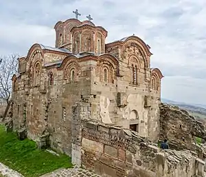 - 🌍 Church of Saint George (Црква „Св. Ѓорѓи“), village of Staro Nagoričane. A highly significant medieval church for both its architecture and frescoes. Saint George was first constructed in 1071 and reconstructed between 1313 and 1318 by the Serbian king at the time, Stefan Milutin. It features one main octagonal dome and four smaller domes. The lower part of the structure is made of large sandstone blocks while the upper part is made of rows of stone and brick. During the reconstruction period, the church's walls were painted with frescoes by Mihailo and Evtihij, among which are depictions of Stefan Milutin and his queen, Simonida. The fresco style is that of the Palaiologan Renaissance, which is characterised by the revival of ancient forms with iconographic innovations. Beside the church is a bell tower as well as some old graves.