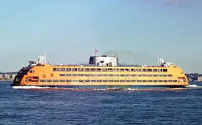 Staten Island can be reached by passenger ferry from Manhattan. The ferry is the most visually pleasing option for arriving on the island, as it passes by Liberty Island and offers stunning views of the Manhattan skyline and New York Harbor. The ferry is free and operates 24 hours a day out of Battery Park in Manhattan and St. George Terminal in Staten Island; even during the early morning hours, it never runs less than once every half hour at the half hour. You can see a current schedule on this page. The 25-minute ferry ride is also sometimes a faster trip from Lower Manhattan to Staten Island than a corresponding trip by car or bus. The ferry allows bicycles on the lower decks, where there are usually bike racks.