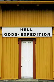 Hell is a village and suburb of Stjørdal town, separated from the centre by the runway. Hell has some 1,400 inhabitants administratively part of the Stjørdal municipality. While there's very little to see there, except for an annual blues festival in September, it's always fun to get a picture of yourself outside Gods Expedition (freight forwarding office). The name Hell stems from the Old Norse word hellir, which means "overhang", "cliff cave". The Norwegian word hell can also mean "luck". The Old Norse word Hel is the same as today's English Hell, and as a proper noun, Hel was the ruler of Hel. In modern Norwegian the word for hell is helvete.