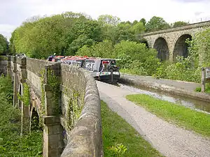 - 🌍 Marple is a village four miles east of Stockport. Here the Peak Forest Canal climbs a flight of 16 locks from its junction with the Macclesfield Canal, which is part of the "Cheshire Ring". A mile north is the canal aqueduct over the River Goyt, completed in 1800, from where you can return via Brabyn's Park and the riverside, a pleasant loop walk. Or you can stay on the riverside for a longer walk south past the remains of Oldknow's Mill and Roman Lakes Park, to Strines and after four miles to New Mills. Half a mile west of Marple, an old railway track has been converted into Middlewood Way cycle path. The village has a few small hotels, eating places and pubs, eg the Ring O' Bells at the canal junction. Trains run every 30 min from Manchester Piccadilly via Marple, Strines and New Mills towards Sheffield, but from Stockport you have to double back via the city, take Bus 383. Agatha Christie named "Miss Marple" for the village after a railway delay here.