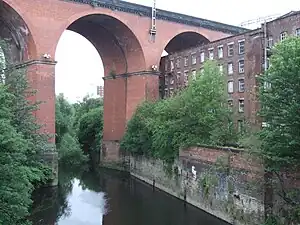 Just north of the station, the tracks cross the River Mersey valley on an impressive 27-arch brick viaduct, built in 1840. It often features in the paintings of LS Lowry.