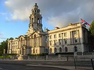 - 🌍 Stockport Town Hall, Edward Street, SK1 3XE, ☏ +44 161 474-3451. Grandiose Edwardian wedding-cake built 1904–08 in white Portland stone - its architect Sir Alfred Brumwell Thomas also built Belfast city hall in similar style. It's normally only open for special events, or booked tours for groups of 15+. However you can stroll into the fine Italianate entrance hall. You might also be able to sneak a peek at the Ballroom with its mighty Wurlitzer, a "Publix 1" designed to accompany silent films. Otherwise catch one of the organ concerts, held monthly on a Monday at noon.