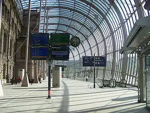 The main train station in Strasbourg is the 🌍 Gare de Strasbourg, 20 Place de la gare.. The station, impressively renovated with a new glass cocoon frontage, is located a short walk west of the town center on Place de la Gare. There are connections to the tram system and buses, with many taxis waiting outside (to the left of the station forecourt).