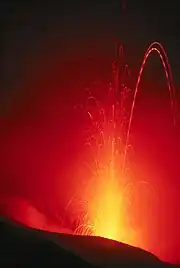 Strombolian eruptions Stromboli gives its name to a type of volcanic eruption that's frequent, visually spectacular, and fairly safe to approach – most of the time. "Strombolian eruptions" are characterized by nearly continuous emission of blobs of lava shot a small distance into the air as "fire fountains" like the one shown in the accompanying image. They're seen to best advantage at night, and a camera capable of timed exposures of several seconds is required to get the most interesting photos. These eruptions are usually viewable in complete safety from the crater rim. However, every few years a more energetic eruption occurs, taking the form of either a lava flow down the Sciara del Fuoco (a collapse feature on the north side of the island) or brief but violent explosions from the summit that propel rocks beyond the crater, sometimes causing minor damage in Stromboli village or Ginostra. These events obviously are hazardous, and furthermore, for some months after a lava flow or explosive event, activity at the summit crater becomes more explosive – and less scenic, as the magma column is well below the crater rim. |