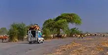Driving in Sudan is chaotic but not especially dangerous by African standards. Visitors to the area who are inexperienced at international driving are advised to hire a taxi or a driver. In most of the country, a 4WD is essential; Sudan's main highway is sealed for much of the way but most of the roads in the country are dirt or sand tracks. Crossing in to Sudan from Egypt via the ferry from Aswan to Wadi Halfa now has the benefit of the Chinese financed tarmac highway covering the 400 km south to Dongola, and then right through to Khartoum, another 500 km. This road is quick for overlanders as there are few military roadblocks, and very little other traffic.