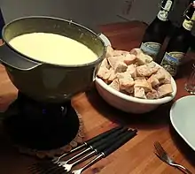 Switzerland is famous for many kinds of cheese like Gruyère, Emmentaler (known simply as "Swiss cheese" in the U.S.), and Appenzeller, just to name a very few of the about 450 kinds of cheese of Swiss origin. Two of the best known Swiss dishes, fondue and raclette, are cheese based. Fondue is a pot of melted cheese that you dip pieces of bread into using long forks. Usually fondue is not made of one single type of cheese, but instead two or three different cheeses are blended together with white wine, garlic and kirsch liqueur with regional variations. The most popular blend of cheese varieties is called moitié-moitié and consists of equal parts Gruyère AOP and Vacherin Fribourgeois AOP. Traditionally fondue is eaten during cold periods at altitude with one pot for the whole table, served with hot black tea and hardly any additional side dishes - not surprising, since it used to be a cheap and often the only dish for a herdsman high up in the mountains far away from civilization with only basic equipment. However you can now get fondue for one person during the summer time in tourist-oriented restaurants. Another cheese dish, raclette, is made by heating a large piece of cheese and scraping off the melted cheese, which is then eaten together with boiled potatoes and pickled vegetables. Cheese-lovers should also try Älplermakkaronen, Alpine herdsmen's macaroni with melted cheese and potato served with apple compote which is another very simple but very tasty dish originally from central Switzerland.