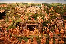 Building nativity scenes ('betlemy' in Czech) is a tradition in Třešť families since two hundred years. At first, paper figures were used, and they were replaced by wooden craved ones since second half of the 19th century. Nativity scenes are constructed as dioramas with landscape made up of tree stumps, moss and other natural materials, sometimes also including running water and moving elements. The 3D landscape merges into a painted background. Nativity scenes in Třešť are regularly rebuilt by their owners for each Christmas season.