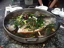 - O.K. Duk, S273 at Xihu Rd, Taicheng (Off S49 freeway entrance towards Sijiu town). Hot pot (dah bene loe) is a popular method of cooking for the Chinese. Most of the time, hot pot restaurants will have a small stove on a table with a pot of water and you add whatever small items you like. At O.K. Duk, you sit at huge stone tables with integrated charcoal pits that stews gigantic 10lb fish in a slightly spicy broth. And when you're done with the fish, you can add in various side dishes like fresh bean curd, deep-fried bean curd, winter melon, beef meatballs.
