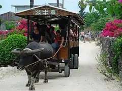 The touristy way to see Taketomi is from cart pulled by a water buffalo (水牛車 suigyūsha), complete with guide telling folk stories (in Japanese) and twanging on a sanshin while at it. This is purely for sightseeing, not a practical means of transport, as the only option is a 30-minute round-trip tour for ¥1200/600 adult/child, including port transfers. While the scene is picturesque enough, animal lovers may have second thoughts, as the water buffaloes themselves aren't terribly pleased about having to lug around heavy carts in the midday heat and small whips are used rather liberally as encouragement.