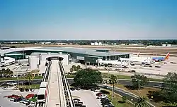 π Tampa International Airport (TPA IATA), 4100 George J Bean Pkwy (8 mi (13 km) West/NW of downtown, on the Tampa side of Old Tampa Bay, via Exit 39 from I-275 at its jct of SR-60 (cross over bay from Clearwater). From St Petersburg it is 21.5 mi (34.6 km) north/NE across the bay via I-275.), β +1 813 870-8700. The airport is built with a central terminal, accessible by ground transportation, where passengers check in for flights and reclaim checked luggage (arrivals). The central terminal is then connected to (4) airside satellite terminals by SkyConnect trains to access flights. Non-stop service is available from most major U.S. cities (and from Puerto Rico); intrastate flights from other parts of the state (w/ Silver Airways, Southwest, Southern Airways Express & Spirit); and international flights from the Bahamas, Canada, Cuba, Great Britain, Germany, Mexico, Panama and Switzerland with the following:.
