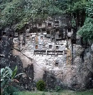 In the land of the Toraja people, many people are notionally Christian, but most are, in practice, animist. They are above all famed for their spectacular (and rather gruesome) burial rites. After a person's death, the body is kept — often for several months or even years — while money is saved to pay for the actual funeral ceremony, known as tomate. During the festival, which may last up to a week, ritual dances and buffalo fights are held, and buffaloes and pigs are slaughtered to ferry the soul of the deceased to the afterlife (puya). The deceased is then finally buried either in a small cave, often with a tau-tau effigy placed in front, inside a hollow tree or even left exposed to the elements in a bamboo frame hanging from a cliff.
