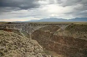 - The Rio Grande del Norte National Monument, administered by the BLM, covers the spectacular Rio Grande Gorge west of Taos. There are three primary sites of interest for visitors: the closest to Taos is the Rio Grande Gorge Bridge, on US Highway 64 about 10 mi (16 km) west of town, which spans the Rio Grande a dizzying 650 ft (200 m) above the river. There are observation platforms at each end of the bridge, and it's definitely not for the acrophobic. North of Taos, near the village of Questa, is the Wild Rivers Recreation Area, at the confluence of the Rio Grande and Red River, with camping and picnicking sites on the rim of the gorge, spectacular views, and hiking trails down into the gorge. South of Taos, on NM Highway 68 towards Española, is the town of Pilar, situated within the gorge itself on the banks of the Rio Grande. In town proper is the Rio Grande Gorge Visitor Center as well as whitewater rafting companies offering trips on the river, and nearby are camping and picnic grounds along the river.