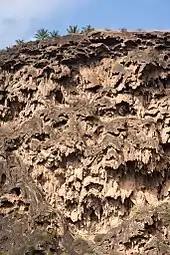 - 🌍 Travertine Curtain (turnoff 200 m west of the road to Wadi Darbat). A 150-m-high escarpment marked with unusual geological formations, formed by the precipitation of calcium carbonate from seasonal waterflow. During the khareef all of the water from Wadi Darbat empties over this cliff face creating a spectacular seasonal waterfall. During the dry season the geological features can be more fully appreciated. To best see this, take the (unsigned) road immediately to the left of the road to Wadi Darbat; this leads to a car park, with a footpath heading through the trees to a better viewing area.