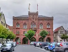 - Marketplace Tauberbischofsheim. It is encircled by half-timbered houses and the Neo-Gothic town hall.