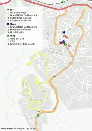 - Hotel Friouato, ☏ +212 3567-2593, fax: +212 3567-2244. Is between Taza-Bas and Taza-Haut, Quartier El-Messaoudia, next to the Boulevard Bel Hassan al Ouazzani, near the Boulevard de 3 Mars. Nice clean rooms with bathroom (hot shower) and TV, a little old-fashioned. In winter-time heated rooms. The service is friendly and obliging.