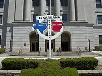 Texarkana is a city of 150,000 people (2016) in the Piney Woods region of Texas and the Timberlands region of Arkansas.