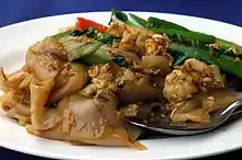 - Pad Thai (ผัดไทย), literally "fried Thai", thin rice noodles, scrambled eggs and shrimp fried in a tamarind-based sauce. Ubiquitous, cheap and often excellent. As an added bonus, it's usually chili-free (you can add yourself, however, or ask to do so if buying of the street, but be warned, it is often really hot).