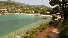 🌍 Salonikos Beach. Hard to reach, yet very popular, scenic bay with sandy beach and beach bar. Under water partly pebbles and rocks. A small restaurant invites you to dine in a romantic setting. The bay is also suitable as anchor bay for sailboat. 200 m further south is a small uncultivated beach and at the end of the peninsula still 2 bays with stone beach. All only accessible by dirt road.