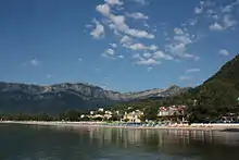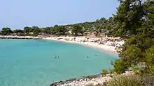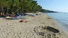 🌍 Timonija Beach. Bay with a sandy beach surrounded by hotels and B&Bs.