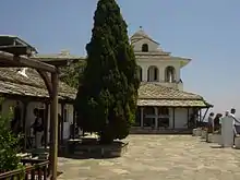 - 🌍 Maries (Μαρίες). A very original old mountain village. Interesting is also the location a few miles outside the village with a small lake and a little waterfall. During July/August when there is no rain, that waterfall is just a runlet. If you continue on the dirt road from there, after 13 km you will reach the Ipsario, the highest mountain in Thasos. The road there is not paved and therefore may not be used with normal rental car, only with 4WD. Between Scala Maries and Maries lies the 🌍 Convent Monastery of the Assumption (Ιερά Μονή Κοιμήσεως Θεοτόκου Μαριών), which is worth a visit, as well as the photogenic 🌍 Convent ruin Stavronikita located above the monastery. An approximately 400-m-long path leads from the parking lot of the monastery up to the ruins.