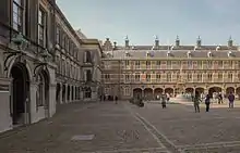 • 🌍 Binnenhof (northwest of the Plein, trams 1 and 9 (Spui stadhuis stop), trams 2, 3, 4 & 6 (Spui/Centrum stop)), ☏ +31 70 7570200, . M-Sa 10:00-16:00; guided tours only (in Dutch +audio guides on some other languiges). The Binnenhof (Inner Court) is a castle built in the 13th century as residence of the count of Holland. Ever since, it has almost subsequently been the seat of the government of Holland, and later all of the Netherlands. It used to be surrounded by moats on all sides. Since then it has been modified countless times to accommodate the expanding Dutch government. The moats have been filled, but the castle still borders on a pond (the Hofvijver, Court Pond). In its waters the old buildings continue to mirror themselves. Today, the Binnenhof houses the two chambers of the Dutch parliament and the Prime Minister's office in a small octagonal tower opposite the Mauritshuis. Enter through one of the gates on Plein or Buitenhof and you will find yourself in a medieval enclosed courtyard, surrounded by architecture from the 13th up to the 19th century. There may be crowds gathered here on occasion because of public demonstrations, TV airings or receptions for foreign officials. In the centre stands the Ridderzaal (Knight's Hall), the centrepiece of the castle, today used for ceremonial purposes. Unfortunately, the other splendid rooms of the complex are closed to the general public. It is possible, however, to attend the meetings of the parliament. The House of Representatives of the parliament meets every Tuesday, Wednesday and Thursday, in a modern chamber from 1992. The Senate meets on a weekly basis, on Tuesdays, and does so in a splendid 17th century Dutch-styled chamber with a lavishly painted ceiling. €5-10 (see online reservation for tours and prices).