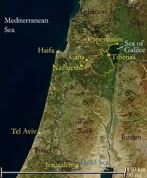 The Jesus Trail, is a 65-km hiking and pilgrimage route in the Galilee region of Israel that connecting many sites from the life and ministry of Jesus Christ. The trail begins in Nazareth, and passes through Sepphoris, Cana, the Horns of Hattin, the Arbel Cliffs, the Sea of Galilee, Capernaum, Tabgha, the Mount of Beatitudes, the Jordan River and Mount Tabor.