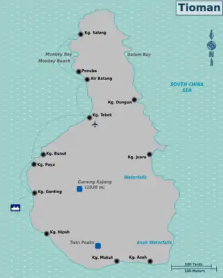 • 🌍 Tioman Airport (TOD  IATA, also known as Pulau Tioman Airport) (located next to Tekek village, Kampung Tekek). SKS airways flies here from Subang airport 4 times per week in 19-seat turboprop aircraft. One way fares can be as low as RM100.