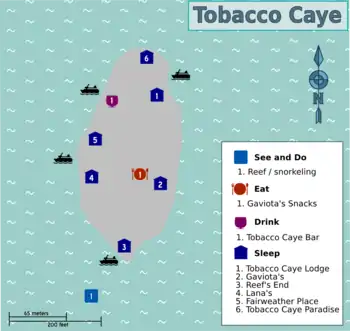 - Tobacco Caye Bar (at the north tip of the island). 4pm-sleepytime. This little open air bar, part of the Tobacco Caye Lodge, is somewhat of a meeting point around sunset and after dinner. If you're staying at the lodge you can put it on your tab.