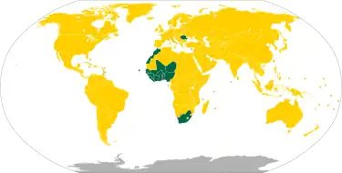 The currency of the country is the West African CFA franc, denoted CFA (ISO currency code: XOF). It's also used by seven other West African countries. It is interchangeable at par with the Central African CFA franc (XAF), which is used by six countries. Both currencies are fixed at a rate of 1 euro = 655.957 CFA francs.