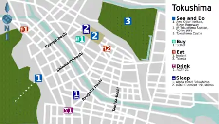 • 🌍 Hotel Clement Tokushima (ホテルクレメント徳島), +81 88-656-3111. Luxury Western-style rooms, with a few Japanese-style. There are three restaurants, including one on the 18th floor with a bar. It's directly connected to JR Tokushima Station. Rooms from ¥10,000 single, ¥19,600 twin.