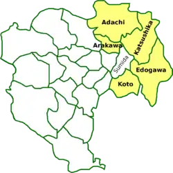 Eastern Tokyo covers the wards of Adachi (足立), Katsushika (葛飾), Edogawa (江戸川), Kōtō (江東) and Arakawa (荒川). Neighboring Sumida (墨田) is covered in its own article, as is the flashy bayside shopping and entertainment district of Odaiba.