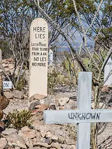 - 🌍 Boothill Cemetery (Boothill Graveyard), Hwy 80 (north of Tombstone). Many outlaws were buried here, with deaths not by natural causes. Heavily restored, entrance through the giftshop. $3 (adults).