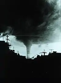 A tornado is a spinning column of very low-pressure air, which sucks the surrounding air inward and upward. They generate high winds (often 100-200 miles/hour) and can lift heavy objects into the air, carrying them as the tornado moves. They begin as funnels descending from storm clouds, and become "tornadoes" when they touch the ground. Unlike hurricanes, tornadoes develop very quickly, giving little advance warning that one is coming (minutes at most), but they are also very short-lived, likewise lasting only a matter of minutes each. They frequently occur in clusters, with several tornadoes striking an area around the same time.