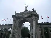 - π Princes' Gates (Strachan Ave & Princes' Blvd). The Princes' Gates is a large ceremonial Beaux-Arts monument marking the eastern entrance to Exhibition Place. The gates are named for Edward, Prince of Wales (later Edward VIII), and his brother, Prince George (later the Duke of Kent), who visited in 1927. The monument is a 300-foot-long, 18-column structure with a 41-foot-high central arch, topped by the Goddess of Winged Victory statue. There are nine pillars to either side of the main arch, representing the nine Canadian provinces in existence at the time of construction. Flanking the central arch are various figures representing progress, industry, agriculture, arts, and science.