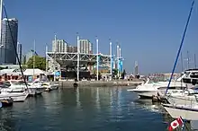 - π Pier 27, 29 Queens Quay E (next pier east of Yonge St). Pier 27 is a condominium development on a former industrial wharf. It contains glass-faced buildings with an unusual design: There are four 10-storey towers, and on top of them sit 3-storey buildings like large box-like bridges at different angles overlapping and connecting pairs of 10-storey buildings. Between the two main buildings there are a series of metal sculptures mostly resembling giant blooming flowers. At the rear of the buildings is a peaceful wharf promenade with benches where you can watch ferries depart to the Toronto Island. On the west side of Pier 27, you can usually get a view of the Trillium, a side-wheel ferry built in 1910 and now in semi-retirement.