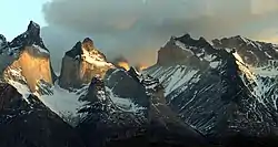 The towers are eroded remains of an uplifted region, this created by granite plutons that uplifted overlaying sedimentary layers of which the lowest is a dark red shale. On the southern side the overlying materials have been completely eroded, leaving only several tall, rounded granitic towers - these are the actual towers of the park. On the northern side, some of the original materials remain and as these have different slope and color, form the tips of the "horns" seen in the image above. At times in the distant past the area was extensively glaciated; some glaciers remain on the eastern side of the uplift (to the left in the image) and form icebergs that flow some distance into the large and scenic Lake Pehoé.