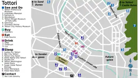 - 🌍 Tottori City Hotel (鳥取シティホテル), 471 Ebisu-machi (10 minutes walk from Tottori Station North Exit: head down Ekimae Dōri towards the city hall, and turn right just after crossing Wakasa Bridge), ☏ +81 857-27-6211. Basic, no-frills business hotel, with a good location in the city center. Rooms from ¥4,700.