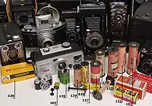 • Many odd sizes of roll film, where an 8, 12 or 20 exposure film with a paper backing is wound onto a spool. A specialised camera store will still have plenty of 120 (and maybe 220, a 24-exposure version of the same roll with the backing paper missing) but most of the others were discontinued by the 1990s. 620, 127, 828, 116, 616 & 122 spool film all differ in mechanical dimensions; short of dealing with specialised vendors like Film for Classics or Frugal Photographer, finding film for these cameras is problematic. It may be possible to load 120 film onto old 620 spools (which were the same format on a thinner spool) in complete darkness (with a darkroom or changing bag), but – unless the camera is just a nostalgia piece – it's likely not worth the trouble just for the novelty of dusting off a simple, low-end "point and click" box camera from 1950 to see if it still can be made to work.