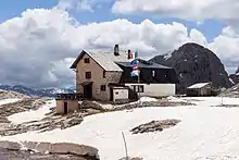 Antermoia refuge (Il rifugio Antermoia/Die Antermoia-Schutzhütte) viewed from the West