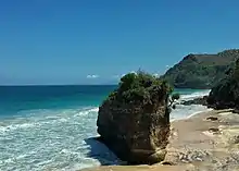 - π Patuk Gebang Beach (Pantai Patuk Gebang), Jengglungharjo, Tanggunggunung. The high wave hitting the rock is one of the main attractions.