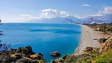 | Mediterranean Turkey Mountains clad with pine woods ascending right from the heavily-indented coastline of the crystal clear sea |