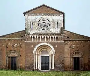 - San Pietro. One of the most fascinating churches in Lazio, this basilica was begun in the 8th century and renovated in the 11th-12th centuries. It is mainly interesting for its façade, which includes a superb rose window as well as some most un-Christian-like decorations, including three-headed carvings, known as trifrons. There are also representations of the Church and of Evil.