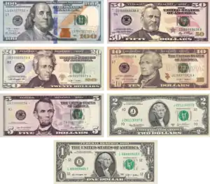 US$100, US$50, US$20, US$10, US$5, US$2 and US$1 bills
