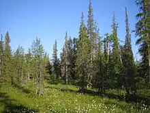 From Valtimo the trail continues to the north-north-east to a 🌍 campfire site. From here it leads to the north-west, north-east and north to a kota by Halmejärvi (🌍 Mäntykangas kota, a 🌍 lean-to shelter and a campfire site at Tavikoski of Verkkojoki. The trail turns westward, crossing Selkäsuo by duckboards (which may be in bad condition), continues towards the small rapids Rumonkosket and turns north, following Kokkojoki on higher ground. There is one more lean-to shelter at (🌍 Kokkolampi. The trail follows the railroad by Alasenjärvi and reaches the Sotkamo border near the 🌍 Rommakkovaara old-growth forest reserve, 2 km east of the village Kekkola (which is on the Nurmes–Sotkamo road just past the Sotkamo border).