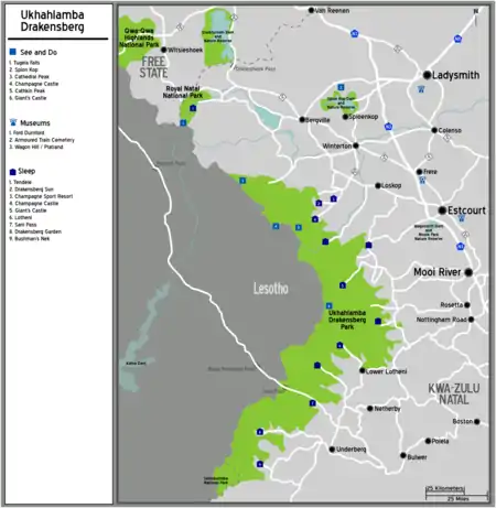 The Royal Natal National Park forms part of Ukhahlamba Drakensberg, but since that park is still free standing and will be experienced as a separate entity by the traveller, it is also treated here as a separate article.