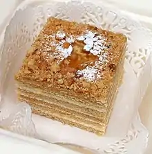 Ukrainian desserts include medovyk (медовик), napoleon (наполеон) cakes and mlyntsi (млинці).