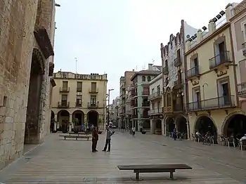 In the square there is a gallery arcade church, popularly called Pèrxens, from different eras and materials, on which rise dwellings; highlights parishioner House, designed by Cesar Martinell (disciple of Gaudí), the structure and decoration typically modernist. Located on two arches of Tudor art modified profile. It's interesting work of graffiti wall wrought: it represents the Catalan flag framed within a diamond around which are organized unique motifs (bows, tinsel ...).