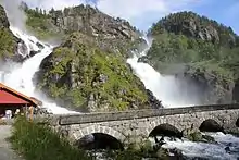 Road 13 runs across Låtefossen waterfall between Odda and Skare
